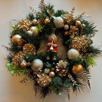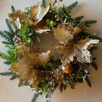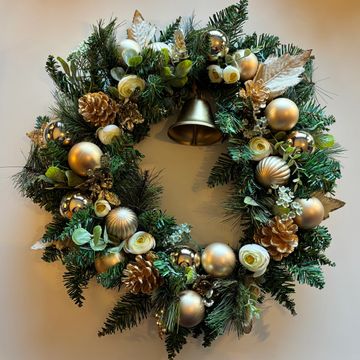 Golden sparkle and baubles cover this traditional wreath - rich golds and warm tones for timeless elegance