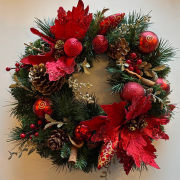 Bold ruby red poinsettias steal the spotlight in this rich, festive wreath - a true Christmas showstopper.