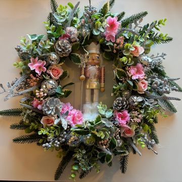 Beautiful silver and pinks nestles amongst lush greenery wrap around the Nutcracker Prince - a fairytale for your door.
