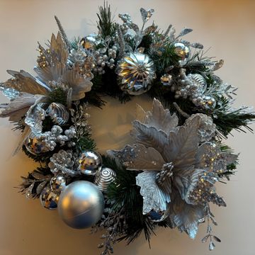 A stunning silver wreath of glistening baubles and poinsettias for an effortless elegance and timeless decor.