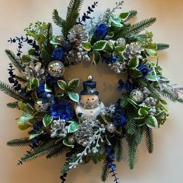 A green and blue wreath with silver highlights, dazzling baubles and a frost dusted snowman.