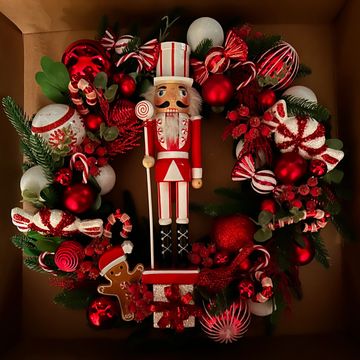 A regal touch of Christmas tradition. This festive wreath of reds and golds wraps around the Nutcracker King commanding timeless style.